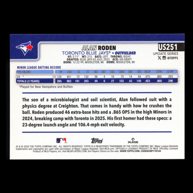 Alan Roden RC 2025 Topps Update Rookie Blue Jays