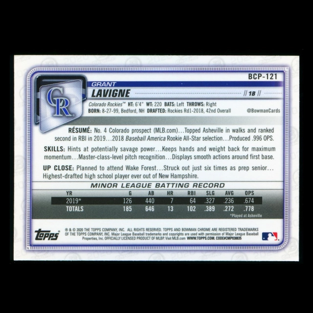 Grant Lavigne 2020 Bowman Chrome Prospect Mojo Refractor Rockies