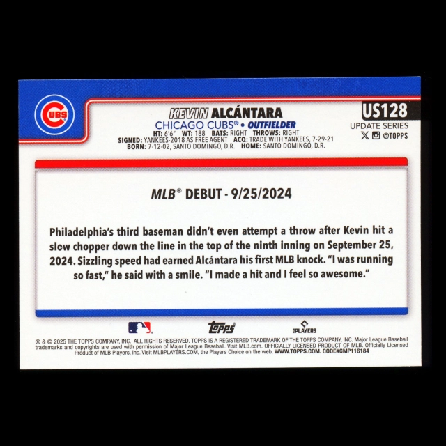 Kevin Alcntara 2025 Topps Update Rookie Debut Cubs