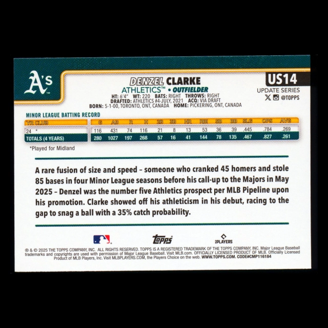 Denzel Clarke RC 2025 Topps Update Rookie Athletics