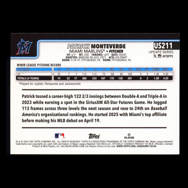 Patrick Monteverde RC 2025 Topps Update Rookie Marlins