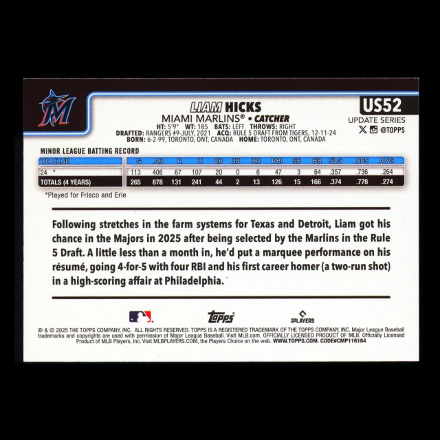 Liam Hicks RC 2025 Topps Update Rookie Marlins