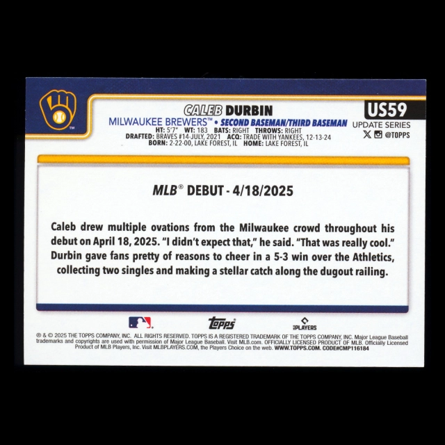 Caleb Durbin 2025 Topps Update Rookie Debut Brewers
