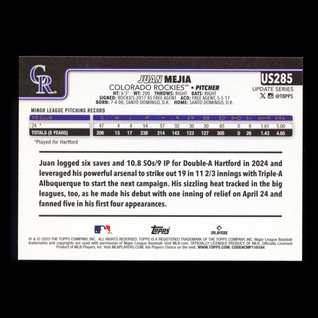 Juan Mejia RC 2025 Topps Update Rookie Rockies