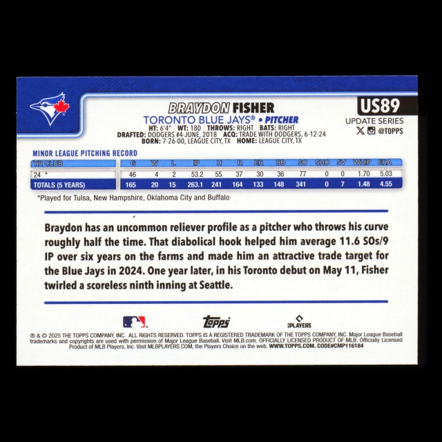 Braydon Fisher RC 2025 Topps Update Rookie Blue Jays