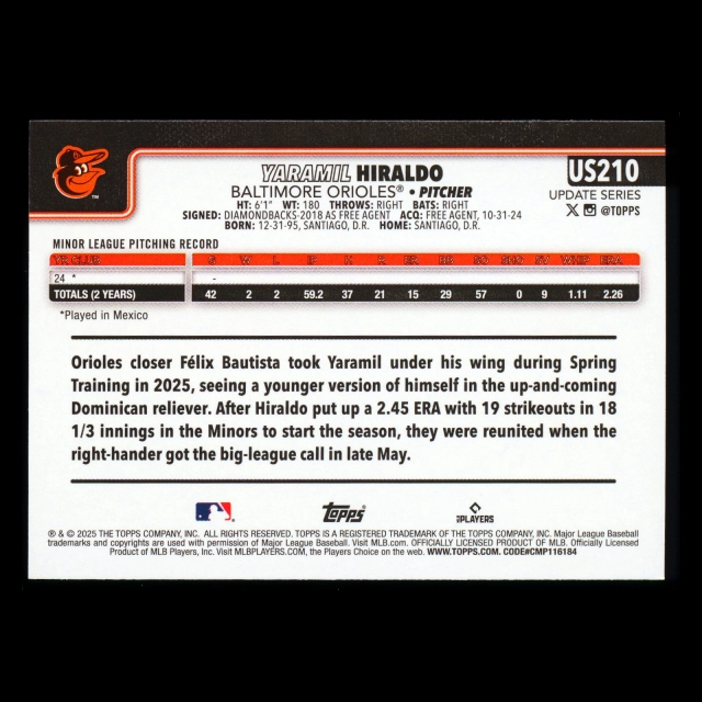 Yaramil Hiraldo RC 2025 Topps Update Rookie Orioles