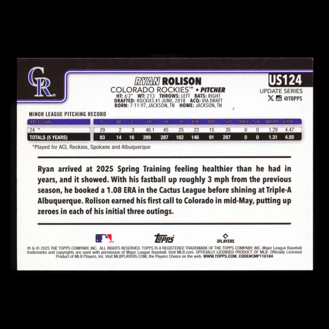 Ryan Rolison RC 2025 Topps Update Rookie Rockies