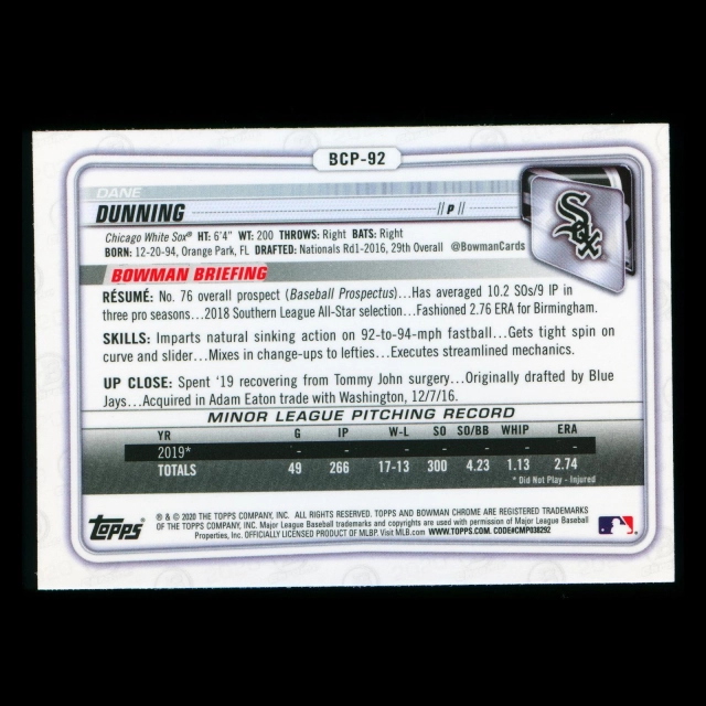Dane Dunning 2020 Bowman Chrome Prospect White Sox