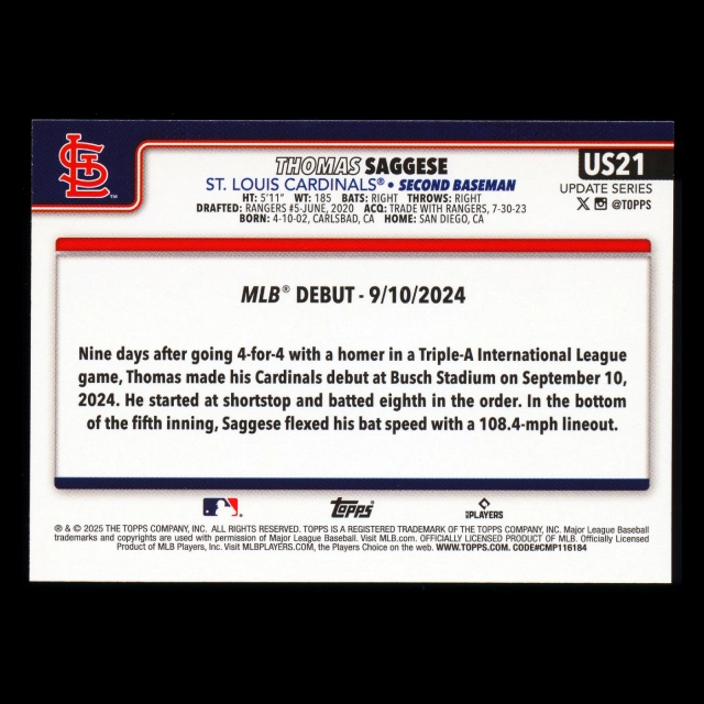 Thomas Saggese 2025 Topps Update Rookie Debut Cardinals