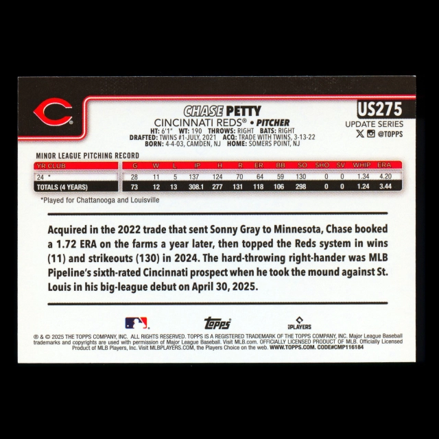 Chase Petty RC 2025 Topps Update Rookie Reds