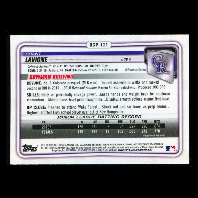 Grant Lavigne 2020 Bowman Chrome Prospect Rockies