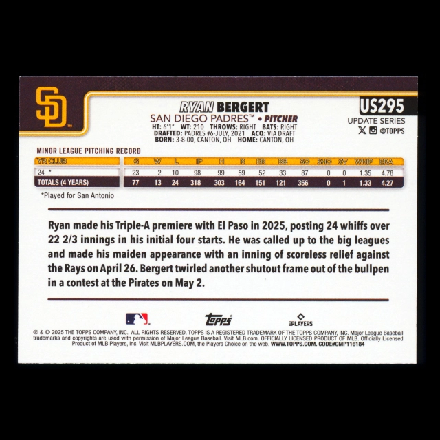 Ryan Bergert RC 2025 Topps Update Rookie Padres