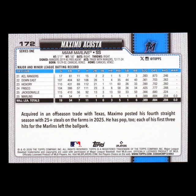 Maximo Acosta RC 2026 Topps Rainbow Foil Rookie Marlins