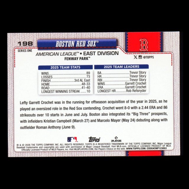 Boston Red Sox 2026 Topps Team Card Red Sox