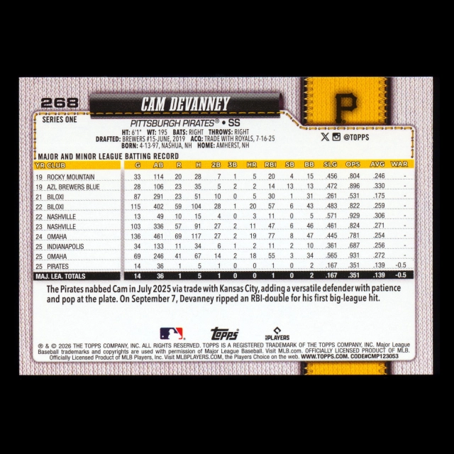 Cam Devanney RC 2026 Topps Rookie Pirates