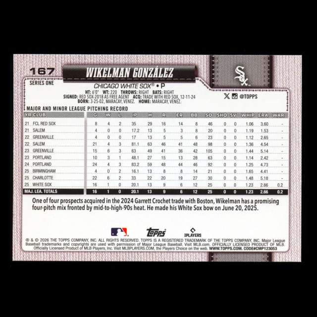Wikelman Gonzlez RC 2026 Topps Rookie White Sox