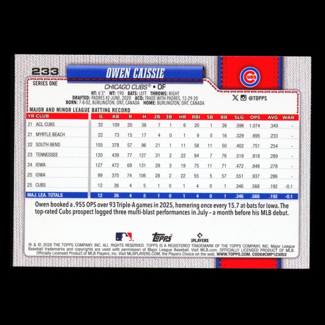 Owen Caissie RC 2026 Topps Rookie Cubs