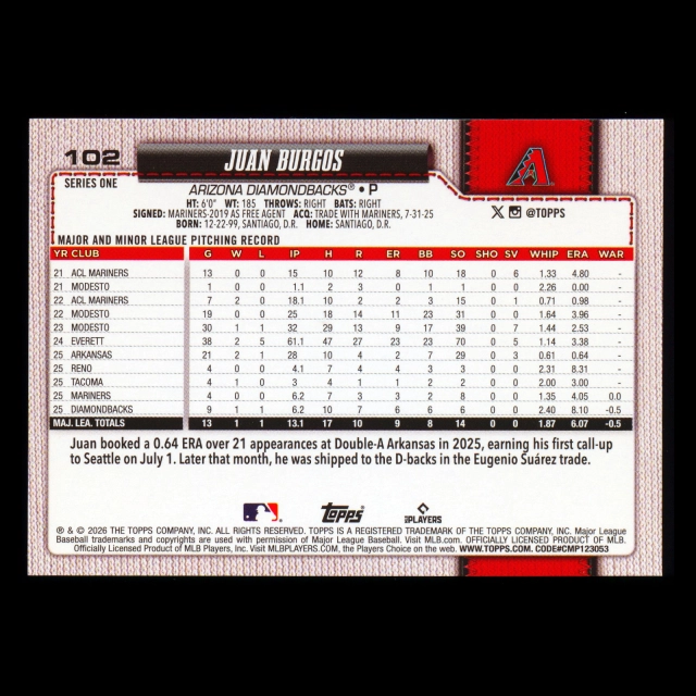 Juan Burgos RC 2026 Topps Rookie Diamondbacks