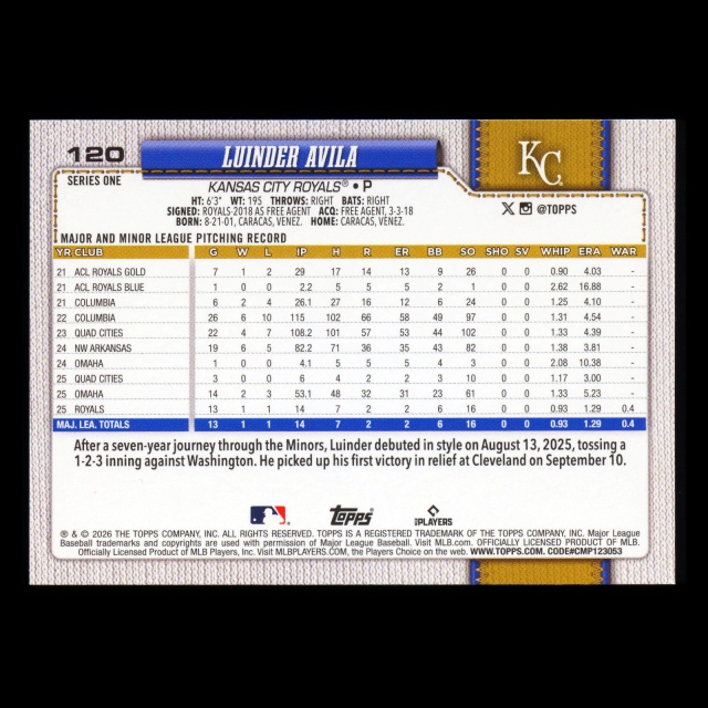 Luinder Avila RC 2026 Topps Rookie Royals