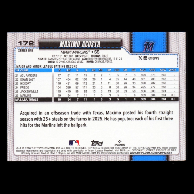 Maximo Acosta RC 2026 Topps Rookie Marlins