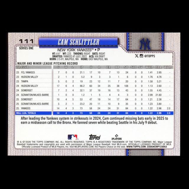 Cam Schlittler RC 2026 Topps Rookie Yankees