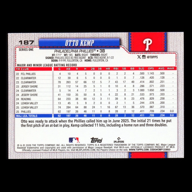 Otto Kemp RC 2026 Topps Rookie Phillies