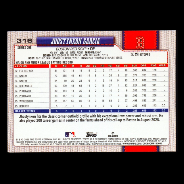 Jhostynxon Garcia RC 2026 Topps Rookie Red Sox