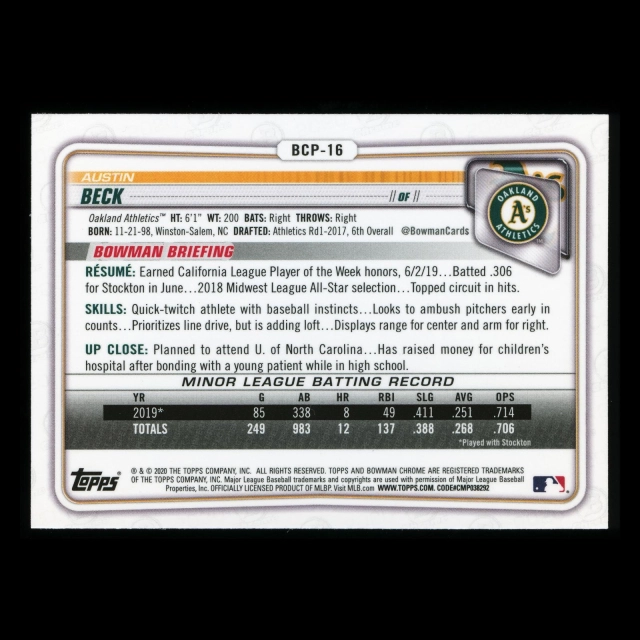 Austin Beck 2020 Bowman Chrome Prospect Athletics