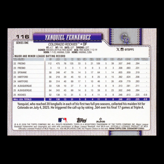 Yanquiel Fernndez RC 2026 Topps Rookie Rockies