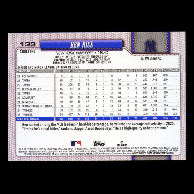 Ben Rice 2026 Topps Diamante Foil Yankees