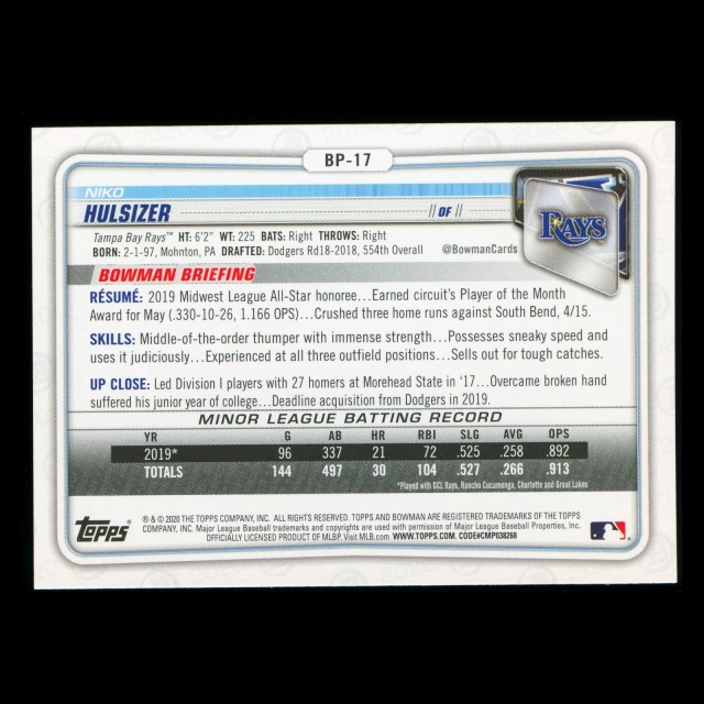 Niko Hulsizer 2020 Bowman 1st Bowman Prospect Rays