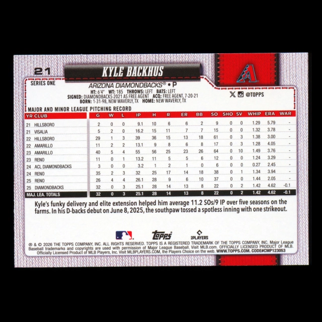 Kyle Backhus RC 2026 Topps Holo Foil Rookie Diamondbacks