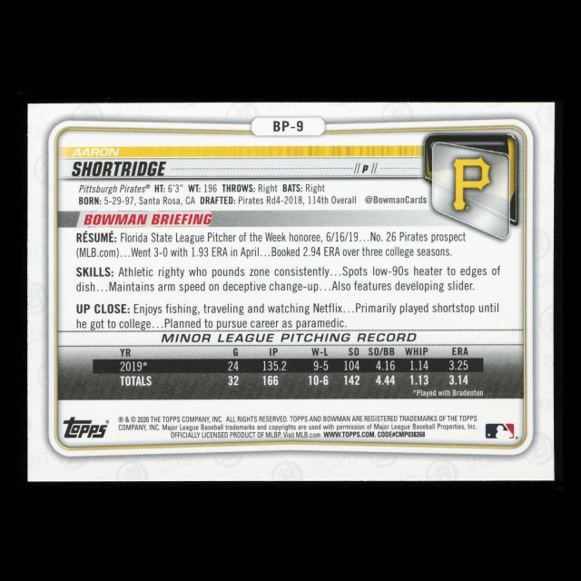 Aaron Shortridge 2020 Bowman 1st Bowman Prospect Pirates
