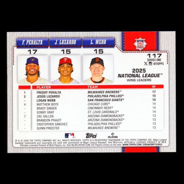 Luzardo - Peralta - Webb 2026 Topps League Leaders Phillies - Brewers - Giants