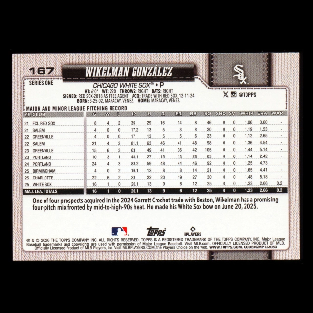 Wikelman Gonzlez RC 2026 Topps Rookie White Sox