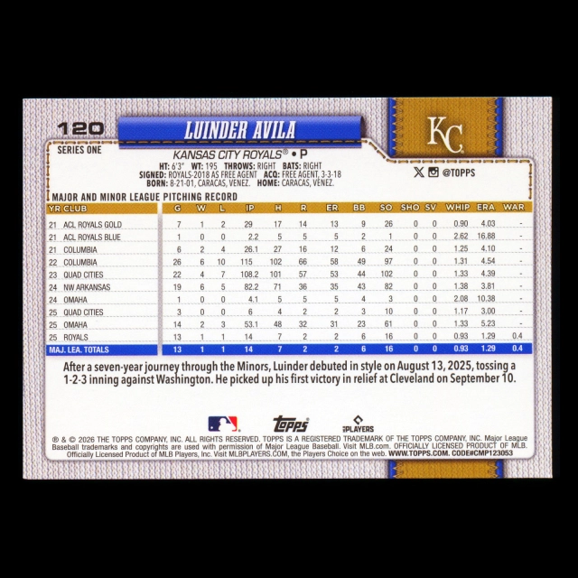 Luinder Avila RC 2026 Topps Rookie Royals