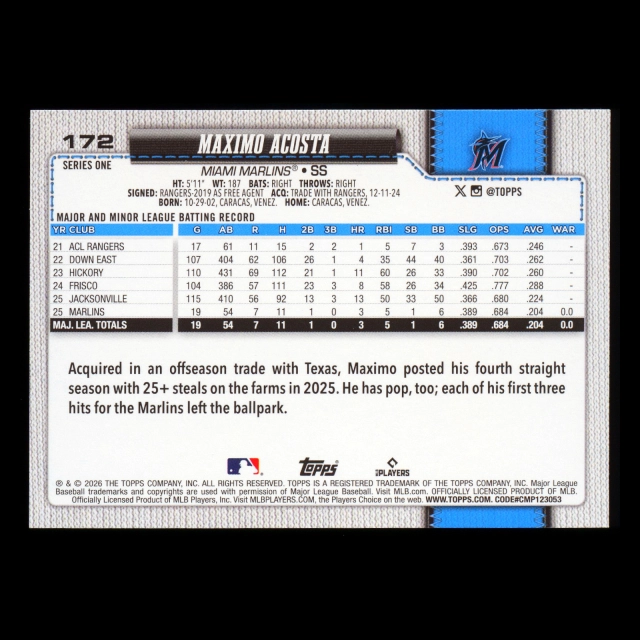 Maximo Acosta RC 2026 Topps Rookie Marlins