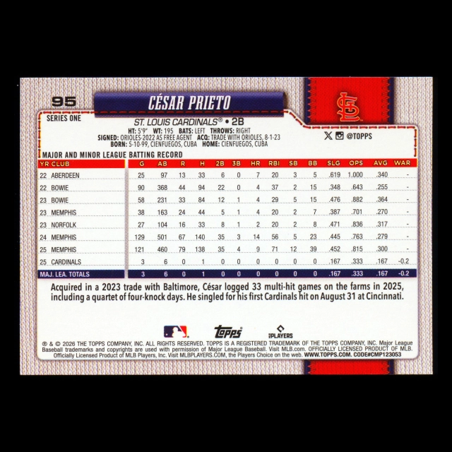 Csar Prieto RC 2026 Topps Rookie Cardinals