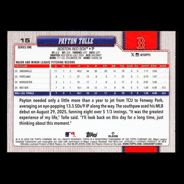Payton Tolle RC 2026 Topps Rookie Red Sox