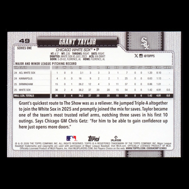 Grant Taylor RC 2026 Topps Rookie White Sox
