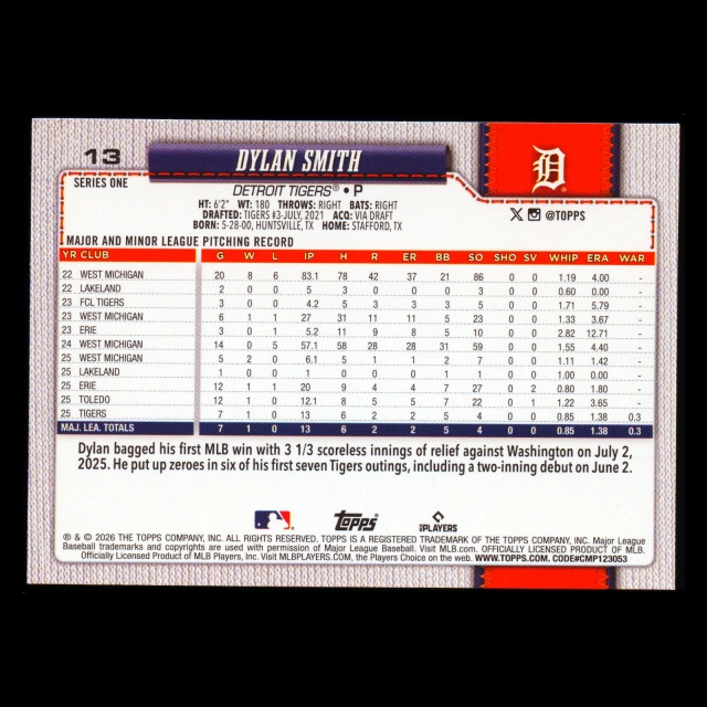 Dylan Smith RC 2026 Topps Rookie Tigers