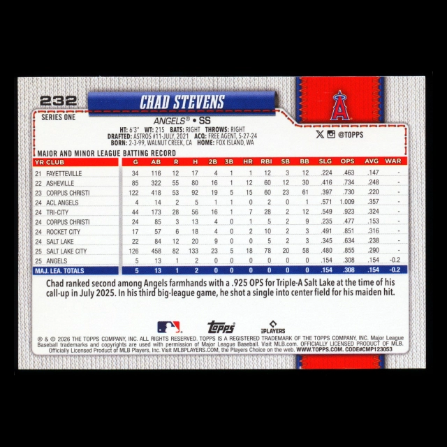 Chad Stevens RC 2026 Topps Rookie Angels