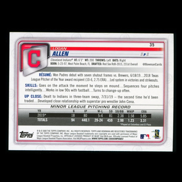 Logan Allen RC 2020 Bowman Rookie Indians