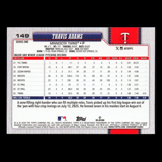 Travis Adams RC 2026 Topps Rookie Twins