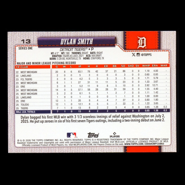 Dylan Smith RC 2026 Topps Rookie Tigers