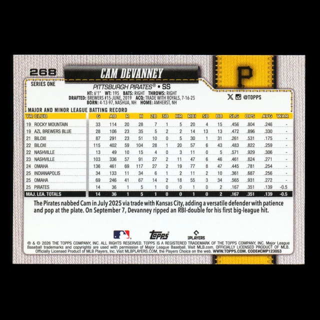 Cam Devanney RC 2026 Topps Rookie Pirates