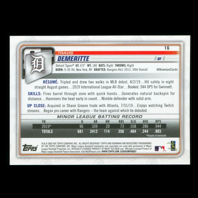 Travis Demeritte RC 2020 Bowman Rookie Tigers