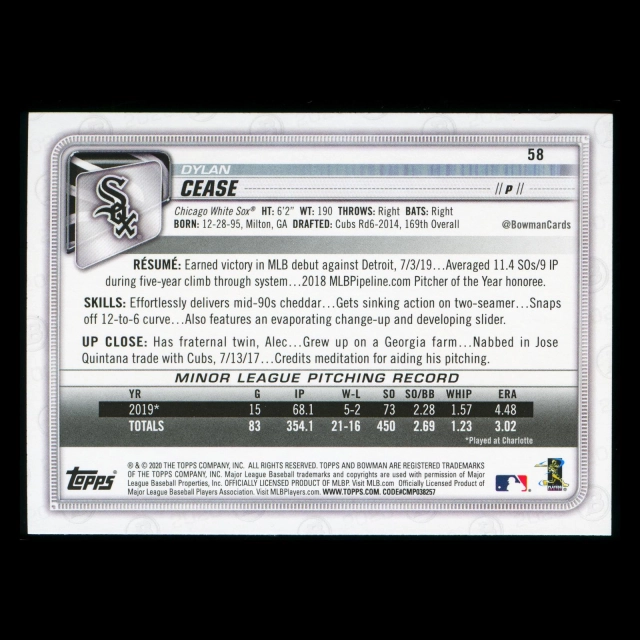 Dylan Cease RC 2020 Bowman Rookie White Sox
