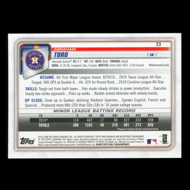 Abraham Toro RC 2020 Bowman Rookie Astros