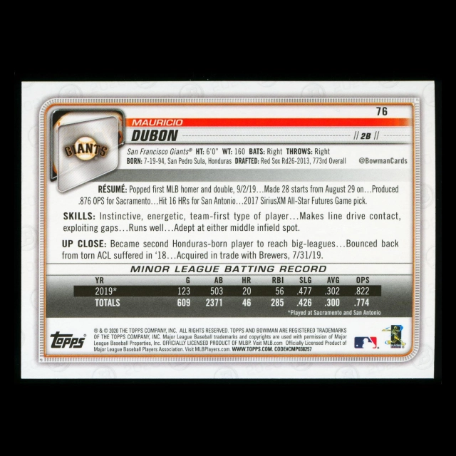 Mauricio Dubon RC 2020 Bowman Rookie Giants